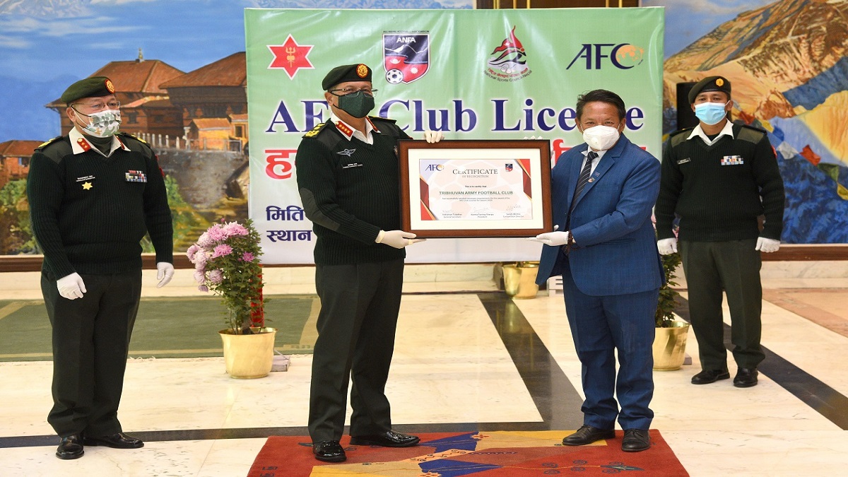 बुधबार आर्मी मुख्यालयमा एककार्यक्रममा एन्फाका अध्यक्ष अध्यक्ष कर्मा छिरिङ शेर्पाले अन्तराष्ट्रिय फुटबल महासंघ फिफा र एएफसीको सबै मापदण्ड पुरा गरी पाएको क्लव लाइसेन्सको प्रमाणपत्र हस्तान्तरण गर्नु भएको हो ।