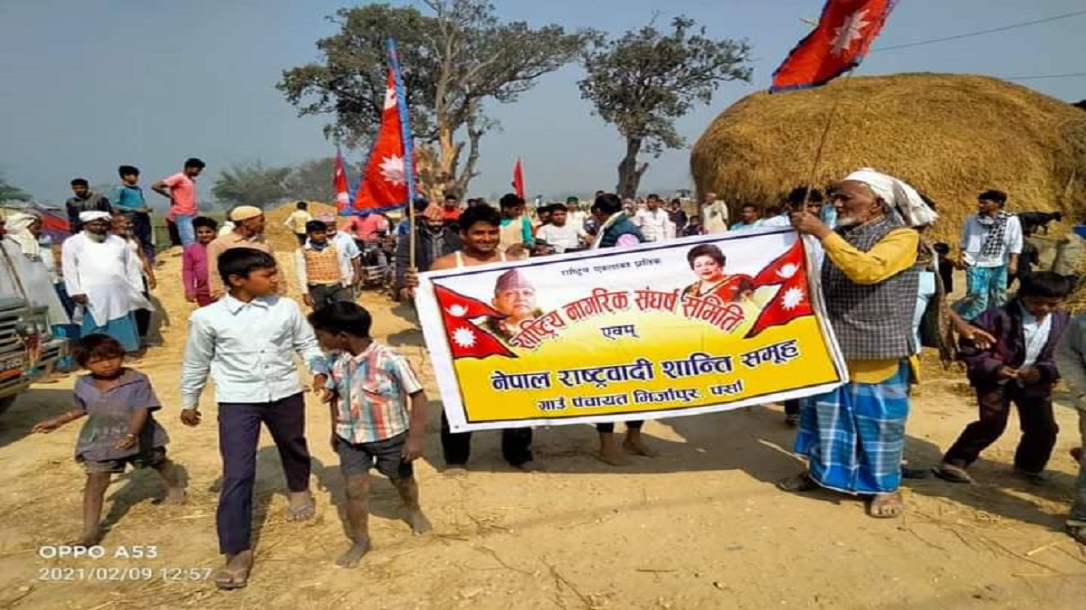 पर्सा, २८ माघ । पर्साको छिपहरमाई गाउँपालिका वडा नम्बर ३ बुढगाईमा राजावादिहरुले प्रदर्शन गरेका छन् । राष्ट्रिय नागिरक संघर्ष समित एवम् नेपाल राष्ट्रवादी शान्ति समूहले राजतन्त्रको माग गर्दै र्‍याली निकालेको हो ।