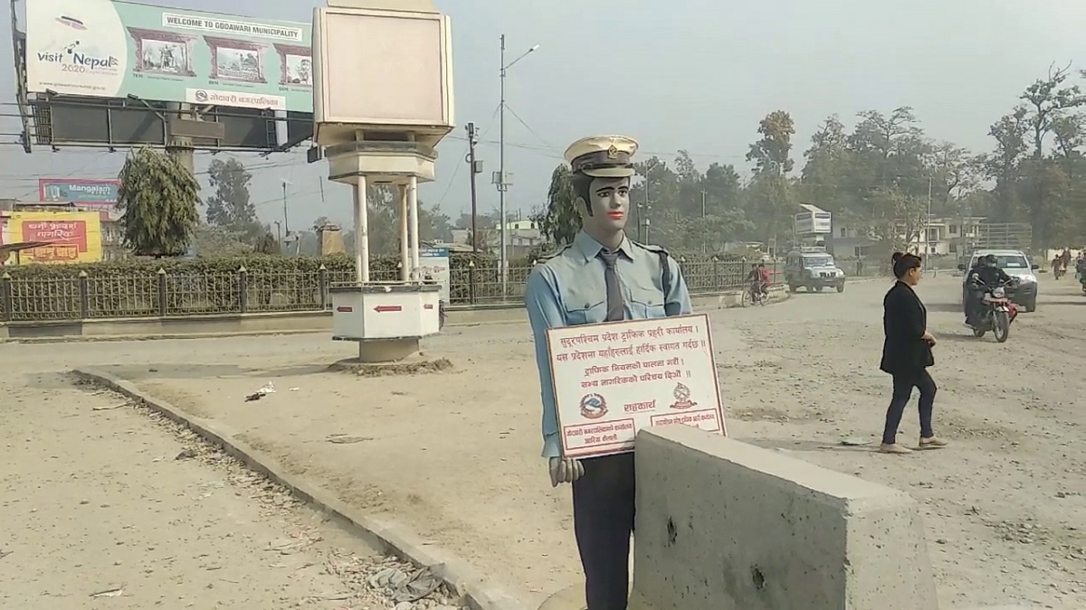 ‘ट्रफिक नियमको पालना गरौ’ लेखेको प्लेकार्ड समातेर उभिएको ट्राफिक प्रहरी जस्तै देखिने गरी चोकचोकमा डमी राखिएको सुदुरपश्चिम प्रदेश ट्राफिक प्रहरी कार्यालय अतरिया कैलालीले जनाएको छ ।