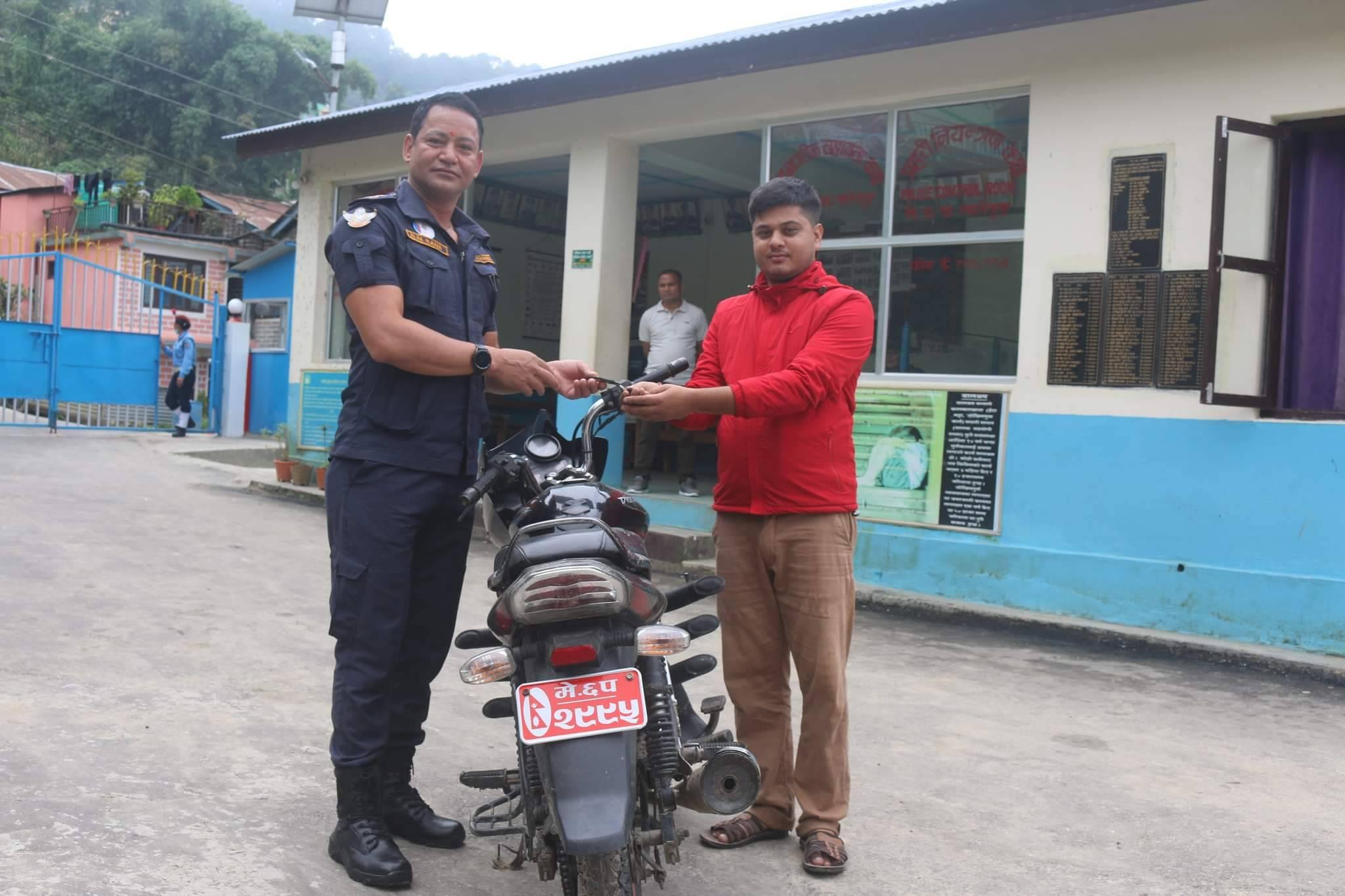 गत १४ भदौ हराएको मे ६ प २९९५ नम्बरको डिस्कभर १२५ सीसी भएको कालो रातो रंगको मोटरसाइकल खोजतलाका क्रममा शनिबार फेला पारी सम्बन्धित धनीलाइ बुझाएको जिल्ला प्रहरी कार्यालय तालेजुङका प्रवक्ता तथा सूचना अधिकारी प्रहरी निरीक्षक कैलाश अधिकारीले जानकारी दिए ।
