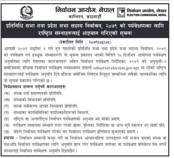 आगमी ४ मंशिरमा हुन गईरहेको निर्वाचनको पर्यवेक्षण गर्न इच्छुक संस्थाहरूले १५ दिनभित्र आयोगमा पर्यवेक्षण अनुमतिका लागि आवेदन माग गरेको हो । संस्था दर्ता प्रमाणपत्रको प्रतिलिपि, संस्थाको विधानको प्रतिलिपि, संस्था नवीकरण भएको निस्साको प्रतिलिपि, संस्थाका कार्यसमितिका पदाधिकारीहरूको विवरण, राष्ट्रिय वा अन्तर्राष्ट्रिय निर्वाचन पर्यवेक्षणको अनुभव भए सोको प्रमाण पेस गर्नुपर्ने आयोगद्धारा आज जारी सूचनामा उल्लेख छ। आयोगका अनुसार निर्वाचन सम्बन्धी कसूर गरी वा निर्वाचन आचारसंहिता उल्लंघन गरी सजाय पाएको संस्था अथवा यसअघि निर्वाचन पर्यवेक्षणका लागि अनुमति प्राप्त गरेर पर्यवेक्षण नगरेका वा पर्यवेक्षण प्रतिवेदन पेस नगर्ने संस्थालाई निर्वाचन पर्यवेक्षण अनुमति दिईने छैन।