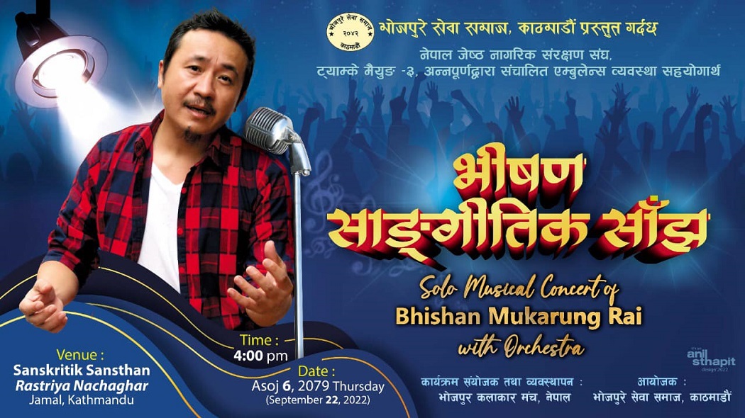 काठमाडौं। एम्बुलेन्स संचालन सहयोगार्थ चर्चित गायक भिषण मुकारुङको एकल साँझ हुने भएको छ। असोज ६ गते बिहीबार सांगीतिक साँझ गर्न लागिएको हो। भोजपुरे सेवा समाज काठमाडौंले एकल साँझको आयोजना गर्न लागेको हो । राष्ट्रिय नाचघर जमलमा हुने सांगीतिक साँझ विशुद्ध सामाजिक सेवाभावका लागि आयोजना गरिएको गायक मुकारुङले बताए। नेपाल ज्येष्ठ नागरिक संरक्षण संघ ट्याम्के मैयुङ–३ अन्नपूर्णले संचालन गरिरहेको एम्बुलेन्स व्यवस्था सहयोगार्थ सांगीतिक साँझको आयोजना गरिएको मुकारूङको भनाइ छ।