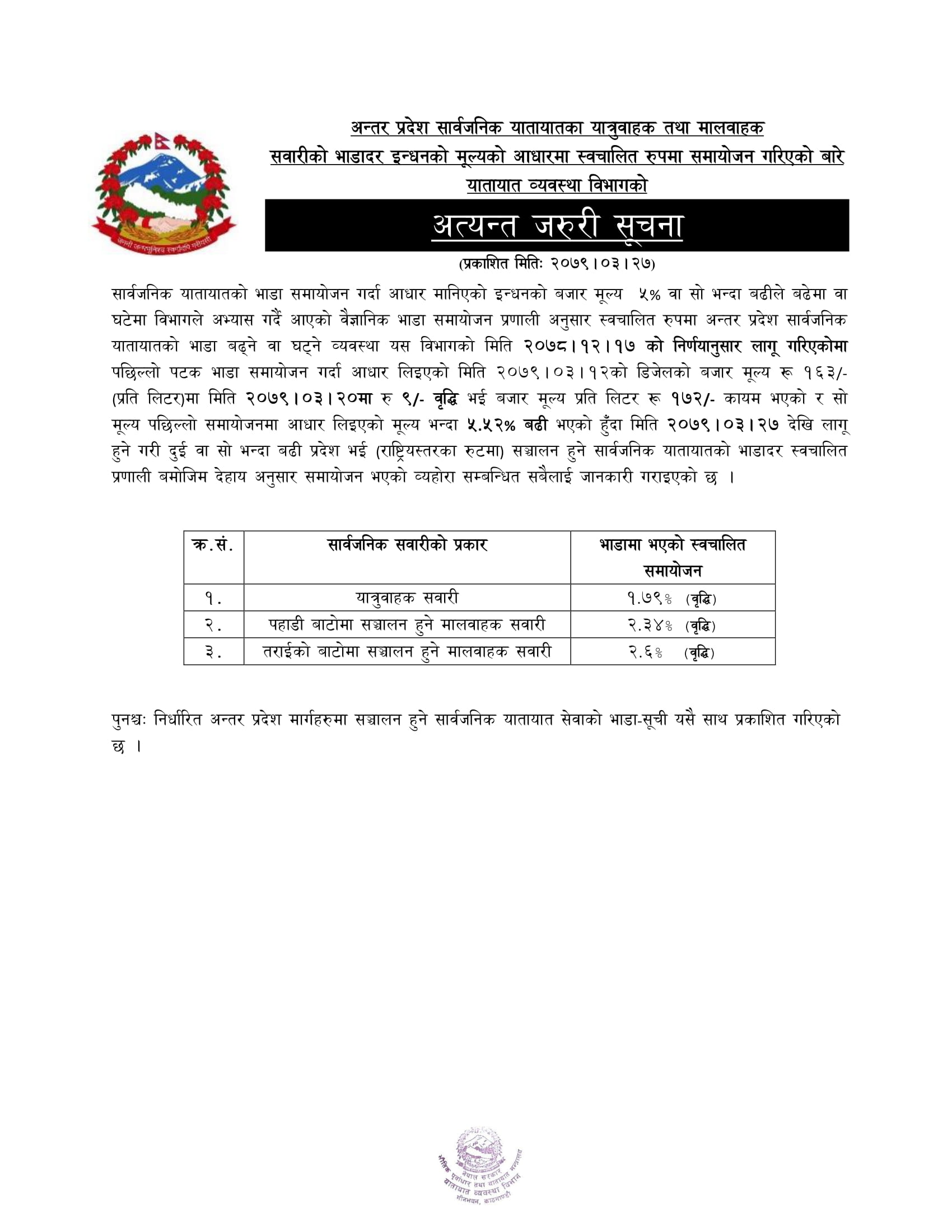 यातायात व्यवसायीहरूको संस्था राष्ट्रिय यातायात व्यवसायी महासंघका अनुसार शनिबारदेखि अग्रिम टिकट बुकिङ खोलिने छ । भौतिक पूर्वाधार तथा यातायात मन्त्रालय, यातायात व्यवस्था विभाग, सडक विभाग, ट्राफिक विभाग र यातायात व्यवसायीहरूको यही भदौ २२ गतेको बैठकले असोज १ गतेदेखि चाडपर्वका लागि अग्रिम टिकट बुकिङ गर्ने निर्णय गरेको थियो ।