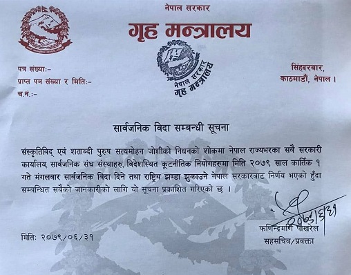 काठमाडौै। सरकारले वाङ्मय शताब्दी पुरुष सत्यमोहन जोशीको निधनमा भोलि मंगलबार सार्वजनिक बिदा दिने भएको छ।