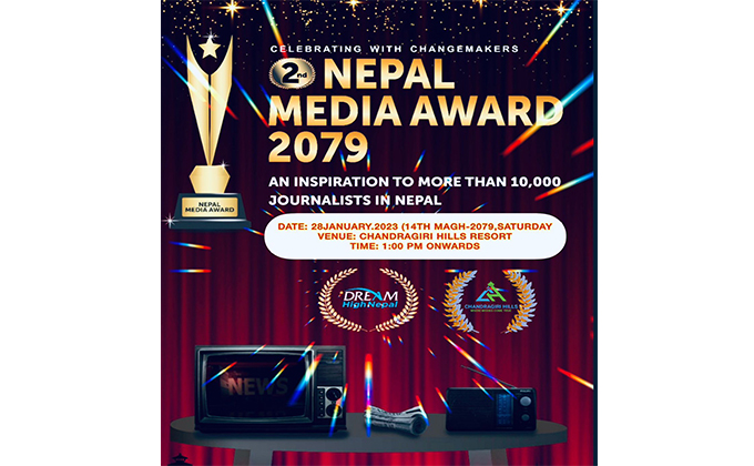काठमाडौं । सञ्चारकर्मीहरुलाई सम्मान र प्रोत्साहन गर्ने उद्देश्यले ‘दोस्रो नेपाल मिडिया अवार्ड २०७९’ आयोजना हुने भएको छ । आगामी १४ माघमा चन्द्रागिरी हिल्स रिसोर्टमा ड्रिम हाइ नेपाल प्रालिले अवार्ड समारोह आयोजना गर्न लागेको हो । अवार्ड समारोहमा नेपाल सरकारका विशिष्ट व्यक्ति र दुई सयभन्दा बढी पत्रकारको उपस्थितामा अवार्ड समारोहको आयोजना गर्ने तयारी ड्रिम हाई नेपालको छ । सक्रिय रूपमा पत्रकारिता गरिरहेका १० हजार बढी पत्रकारलाई प्रोहत्सान गर्ने उद्देश्यका साथ दोस्रोपटक नेपाल मिडिया अवार्ड आयोजना गर्न लागिको ड्रिम हाई नेपालका सञ्चालक कमल जिसीले जानकारी दिए ।