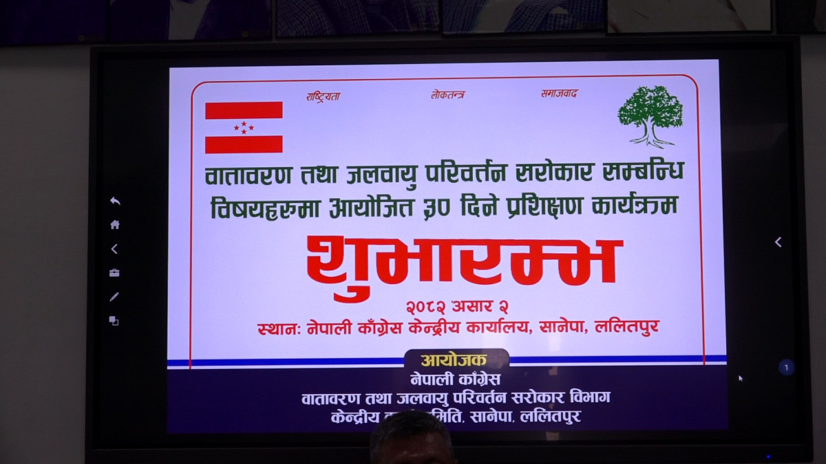 काठमाडाैं । नेपाली कांग्रेसले वातावरण तथा जलवायु परिवर्तन सरोकारसम्बन्धी ३० दिने प्रशिक्षण कार्यक्रम शुरु गरेको छ । सोमबार पार्टी केन्द्रीय कार्यालय सानेपामा वातावरण तथा जलवायु परिवर्तन सरोकारसम्बन्धी ३० दिने प्रशिक्षण कार्यक्रमका शुभारम्भ गरिएको हो ।