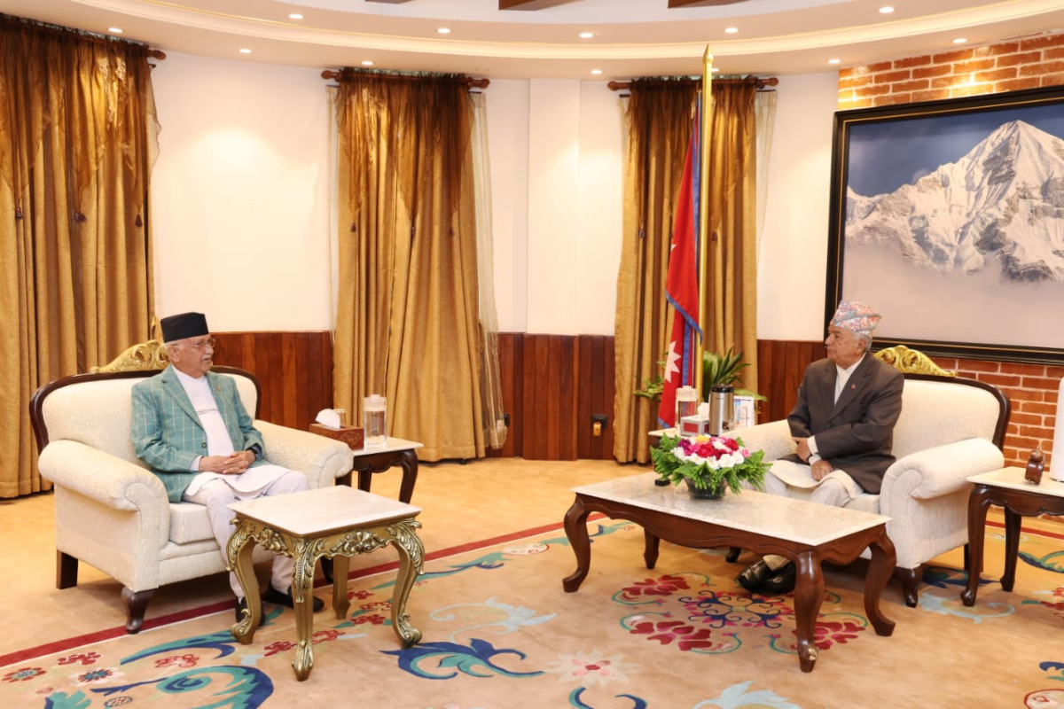 काठमाडाैं । राष्ट्रपति रामचन्द्र पौडेलसँग प्रधानमन्त्री केपी शर्मा ओलीले भेटवार्ता गर्नुभएको छ । प्रधानमन्त्रीको सचिवालयका अनुसार प्रधानमन्त्री ओलीले आइतबार बिहान शितलनिवास पुगेर राष्ट्रपति पौडेललाई भेट्नुभएको हो ।