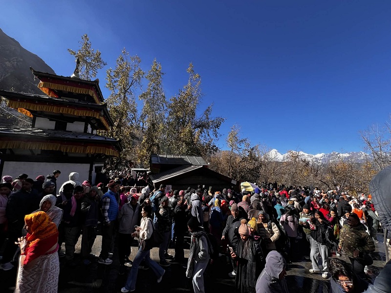 मुक्तिनाथमा आज बिहानैदेखि दर्शनार्थीको सङ्ख्याले परिसर पूरै खचाखच भरिएको कोषाध्यक्ष गुरुङको भनाइ छ । मन्दिरमा दर्शनार्थीको सहजताका लागि सुरक्षा निगरानी र लाइनबद्ध गराउन सुरक्षा निकायसँगै स्वंयसेवक खटाइएको उनले जनाए।हिउँदयाम शुरू भइसकेकाले चिसोसमेत बढेकाले हाई–अल्टिच्युड हुने सम्भावनालाई मध्यनजर गर्दै स्वास्थ्यकर्मी र हाई–अल्टिच्युड ट्रिटमेन्ट सेन्टरलाई तयारी अवस्थामा राखेर दर्शन कार्यमा सहजीकरण गरिएको कोषाध्यक्ष गुरुङले बताए ।