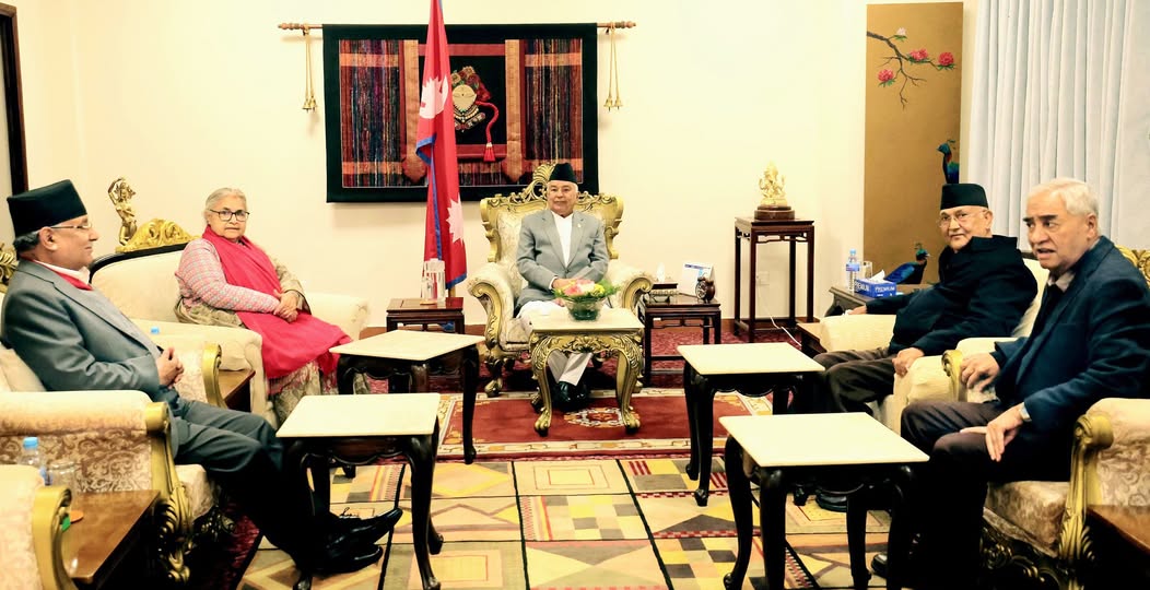 काठमाडाैं ।  राष्ट्रपति रामचन्द्र पौडेलसँग प्रधानमन्त्री सुशीला कार्की, नेपाली कांग्रेसका सभापति शेरबहादुर देउवा, नेकपा एमालेका अध्यक्ष केपी शर्मा ओली र नेपाली कम्युनिस्ट पार्टीका संयोजक पुष्पकमल दाहाल प्रचण्ड ले संयुक्त रूपमा भेटवर्ता भएको छ । जेनजी आन्दोलनपछि उहाँहरूबीच पहिलो पटक भेटवार्ता भएको हो ।