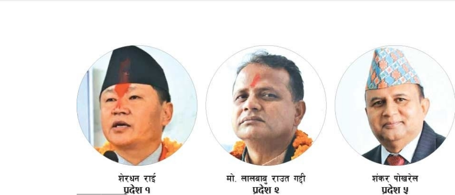 काठमाडौँ,३ फागुन । प्रदेश १, २ र ५ मा बुधबार मुख्यमन्त्री नियुक्त भएका छन् । प्रदेश १ मा एमालेका शेरधन राई, २ मा संघीय समाजवादी फोरमका मोहम्मद लालबाबु राउत गद्दी र ५ मा एमालेकै शंकर पोखरेल नियुक्त भएका हुन् ।