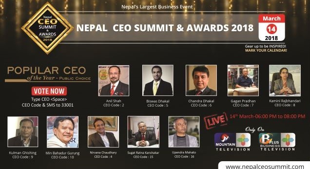 आफुलाई मन परेको व्यक्तिलाई अनलाईनमा nepalceosummit.com/ceopopularchoice गई भोट गर्न सकिनेछ र एस.एम.एस. मार्फत CEO <स्पेस > CEO Code टाइप गरेर ३३००१ मा एस.एम.एस. गर्न सकिनेछ । साथै कार्यक्रममा सहभागी हुन http://nepalceosummit.com/participation मा दर्ता गर्न सकिनेछ ।