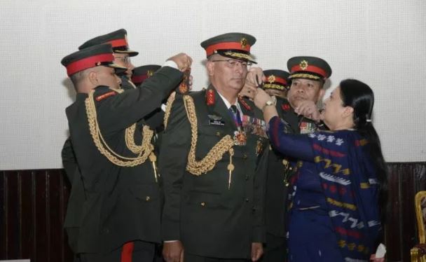 काठमाडौं, २५ भदौ । नेपाली सेनाको ४३ औं प्रधानसेनापतिमा नियुक्त हुनु भएका पुर्णचन्द्र थापालाई राष्ट्रपति बिद्यादेवी भण्डारीले आईतबार आयोजित बिषेश समारोहमा दज्र्यानी चिन्ह प्रदान गर्नुभयो । राष्ट्रपति भण्डारी सेनाको परमाधिपति हुनुहुन्छ ।