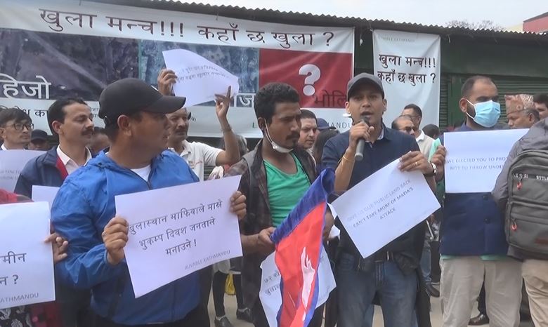 काठमाडौं, १२ बैशाख । काठमाडौंको खुलामञ्च अतिक्रमणको विरोधमा स्थानीय आन्दोलनमा उत्रिएका छन । काठमाडौं महानगरपालिकाको मिलेमतोमा खुलामञ्च अतिक्रमण गरिएपछि त्यसको विरोधमा स्थानीयबासी र सम्पदाप्रेमीहरुले आन्दोलन सुरु गरेका हुन् ।