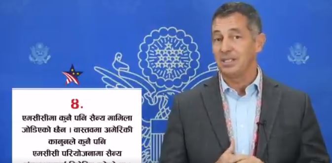 एमसीसी परियोजनाको लक्ष्य विद्युत् लाइन निर्माण र सडक स्तरोन्नति गरी आर्थिक विकासलाई सघाउने रहेको भन्दै दूतावासले त्यसमा कुनैपनि सैन्य मामिला नजोडिएको र एमसीसी परियोजनामा सैन्य संलग्नतालाई अमेरिकी कानुनले नै निषेधित गरेको स्पस्ट पारेको बताएको छ ।